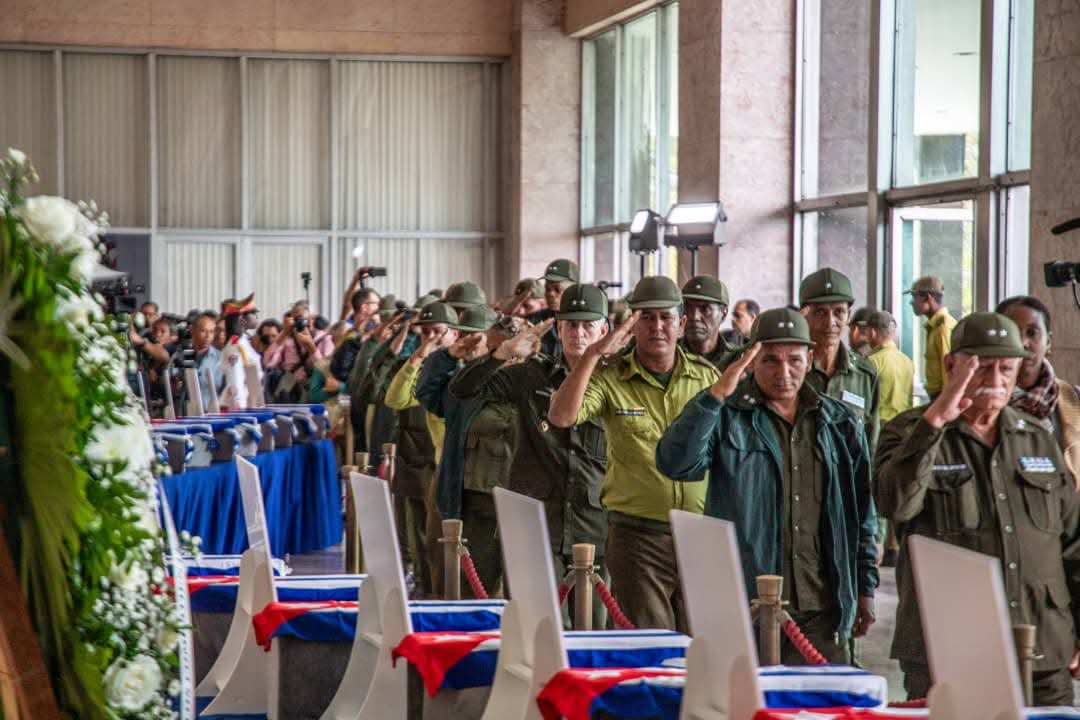 Y en el orden de las cosas, hasta el dolor tiene su geometría sagrada. Mira esa lista de nombres. Parecen solo 32, pero no lo son. Es la cola del honor que inicia la fila interminable de un pueblo que, incluso para despedir a sus mejores, lo hace con la disciplina que nos inculcaron Céspedes y Maceo, Martí y Fidel.