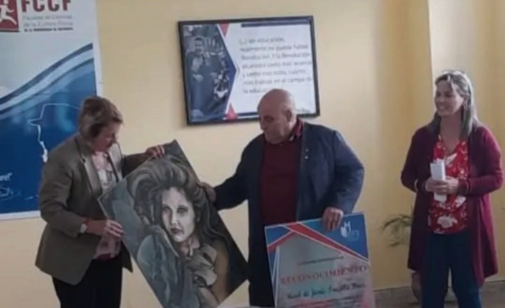 El homenajeado recibió, además, una obra de plástica donada por la artista y profesora de la carrera de Educación Artística de la Facultad Ciencias Sociales y Humanidades de la casa de altos estudios Marlin Almeida.