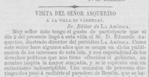Eduardo Asquerino llegó a Cuba en noviembre de 1865. Su visita significó un espaldarazo a las aspiraciones reformistas de los cubanos, en especial de los agrupados en torno al periódico El Siglo. En La América, revista donde colaboraron destacadas personalidades cubanas como José Antonio Saco, Antonio Bachiller y Morales, Calixto Bernal, entre otros, Asquerino había sido un apasionado defensor de las reformas para las Antillas.