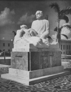 “…ha sido reconstruido el dramático momento del año 1900, en que la Comisión de Fiebre Amarilla del Ejército Americano iniciaba la inoculación de la terrible enfermedad por medio de un mosquito infectado, en uno de los médicos militares sometidos voluntariamente a la riesgosa prueba. Entre los que presencian la operación aparecen de pie, a la izquierda, el sabio cubano autor de la teoría en experimento, y a la derecha, sentado, el gobernador militar, general Leonard Wood”.
