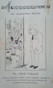 “Nombre sin tacha. De hombre sin mácula, de ciudadano ejemplarísimo, de modelo de caballeros y sinónimo de todas las virtudes. Así el médico que ha muerto. Un corazón como pocos, un alma abierta siempre a todas las bondades, una conciencia limpia y una ejecutoria sin igual. Inmaculado el doctor Adolfo Valhuerdi. En quien se aunaban en el consorcio más hermoso, más grande, cualidades, dotes y virtudes, que le reconocen todos. Fue un padre de familia excelente, fue un médico filántropo y desinteresado, desde el pedestal de su fama y su prestigio, fue como amigo, el más consecuente y el más leal de los hombres, y fue, también, como ciudadano, de los que honran la Patria, la prestigian y la enaltecen”.