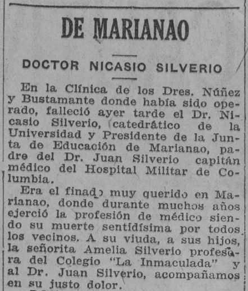 “…bueno y muy querido doctor Nicasio Silverio, cuya muerte, ocurrida recientemente, fue sentidísima”, (…) “…cuya memoria se conservará como un santo culto en hogares innumerables de Mariano”. (ALH)