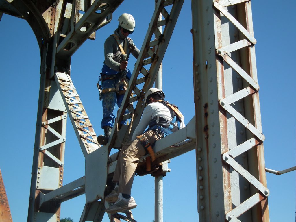 Esta entidad se especializa en trabajos verticales con técnicas de alpinismo. El martilleo incesante intenta retirar la herrumbre de la base metálica, “trabajo fatigoso”, como advierte el joven Yusbel Martínez Fleites, integrante de la empresa.