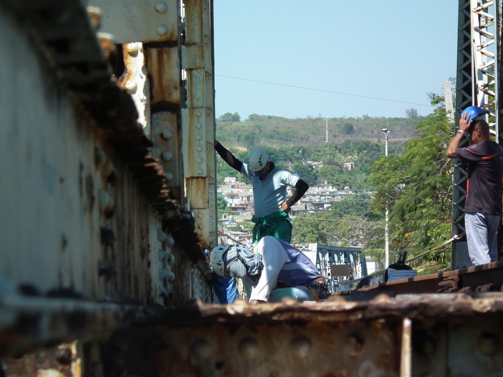 Si bien sobre el puente giratorio ya no se escucha el habitual pito de las locomotoras, hace algunas jornadas en el lugar sí se aprecia un golpeteo incesante que retumba a metros de distancia. Se trata de los especialistas de la mipyme Cima, que desde bien temprano laboran allí, bajo la supervisión de la ingeniera civil Enia Díaz Nodarse, especialista en estructura de la Empai.